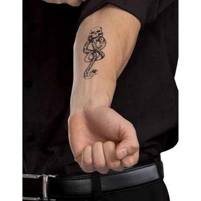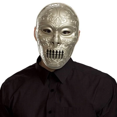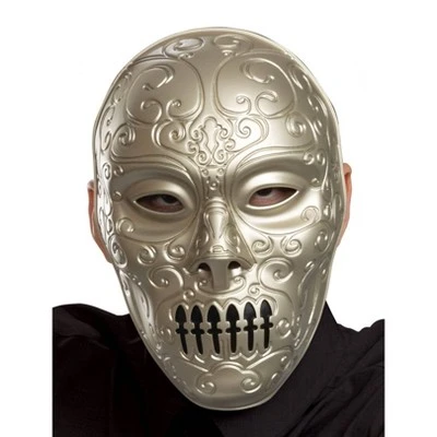 Follow Lord Voldemort and practice the Dark Arts of wizarding with this Death Eater Accessory Kit, sold exclusively at Target! This kit features a half mask with intricate swirl patterns throughout and an adjustable elastic strap at the back. It also comes with a temporary tattoo version of the Dark Mark skull and snake to put on your wrist. Shirt and pants not included.