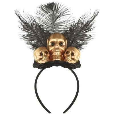Go from gothic to golden with this Golden Skeleton Headband. This fancy hairpiece features golden skulls and black feathers to bring your dark Halloween costume to glamourous new heights! Perfect to add to a black dress to make it spooky and festive, or if you just want to top off your skeleton costume with an attention grabbing piece.
