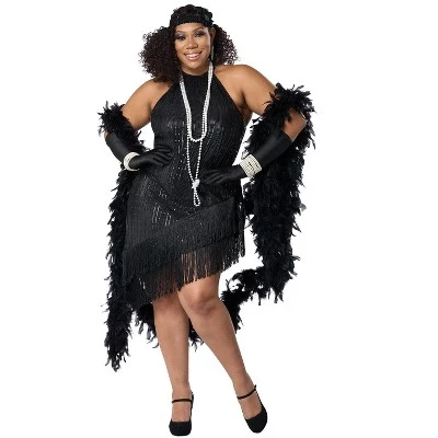 This dazzling costume is perfect for anyone looking to add some vintage glamour to their roaring twenties celebrations. The Fabulous Flapper Costume features a black fringed dress with a high neckline and an intricate art deco design. It is designed to ensure a comfortable and flattering fit for all body types. The costume also includes a black sequined headband with a flower clip, completing the iconic 1920s style.