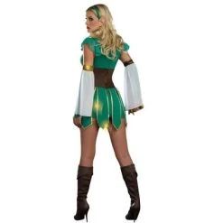 Step back in time. Be one classy lass too! This adult Warrior Elf Costume features the stretch knit and chiffon peasant style dress with lace-up corset detailing at waist and pelted skirt hemline with metallic gold piping, matching sleeves, and the headband with elf ears.