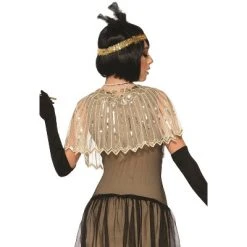 Add some more glitz and glamour to your flapper costume with this 20’s Sequin Shawl in beige. This capelet shawl features a sheer beige fabric with gold sequins and beads to add some fun razzle dazzle to any look!