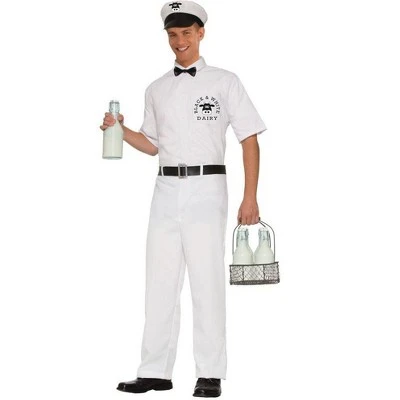 Deliver dairy in style this Halloween when you wear this Men’s Milkman Costume. This awesome outfit pays homage to the traditional look that was associated with the milkmen who would go door to door dropping off milk in either containers or cartons. With this ensemble you will receive a shirt, pants, hat, bow tie, and a belt. The shirt, hat, and pants are all predominantly white, mirroring the color of the product that this figure provides. The pocket on the white button down shirt features an image of a black cow’s head and has it emphasized by text that reads, Black & White Dairy. The same cattle symbol reappears on the center of the hat. The black belt and matching black bow tie give your character a clean-cut appearance. You’ll have friends exclaiming, Holy Cow! when they see how good you look in this milkman costume!