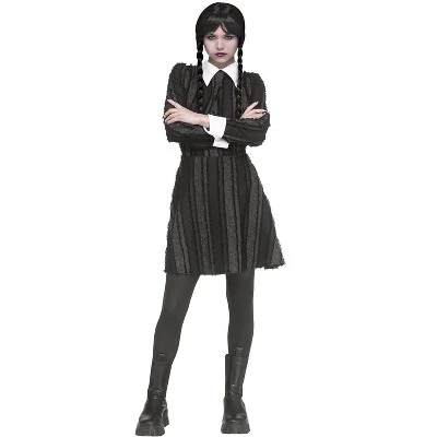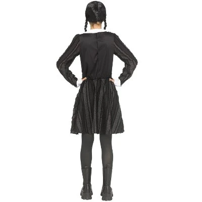 They say on Wednesdays, we wear pink, but we think Wednesday is the perfect day to wear black. This gothic costume is perfect for that macabre look. This Creepy Coed Adult Costume features a black dress in alternating materials to create a vertical striped pattern, faux front buttons, and a white pointed collar and sleeve cuffs for a look that would fit right in with the Addams family.