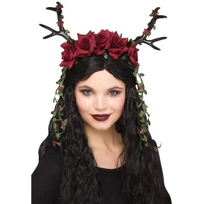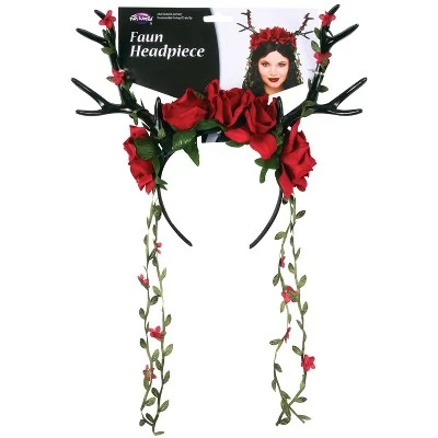 Put on this Faun Fantasy Headpiece atop your head to instantly feel like a woodland forest animal. This floral headpiece features dark red roses, black deer antlers, and cascading vines for a gothic fairytale look. Dress up as a deer or faun or just add a touch of whimsy to your outfit with this mesmerizing accessory.