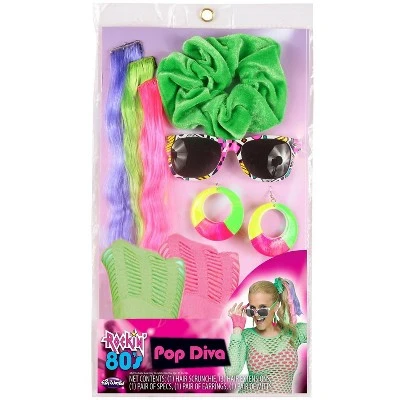 Get that totally eighties look with this Rockin’ 80s Pop Diva costume kit. This costume kit is sure to get you feeling nostalgic for the great eighties with a green scrunchie, colored hair extensions, wacky patterned sunglasses, bright earrings, and pink and green mitts.