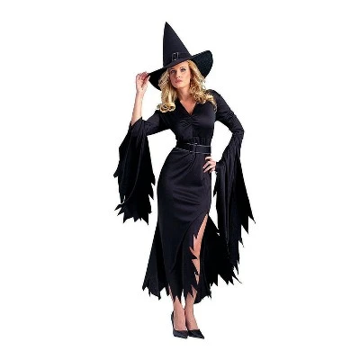 Cast a spell over all this Halloween with the Women’s Witch Costume. Dramatic black and sassy styling make it a standout look. Halloween costume includes a dress with a slit skirt and draped sleeves, belt accent and witchy hat with buckle. Great for themed group costumes or a fun couple look.