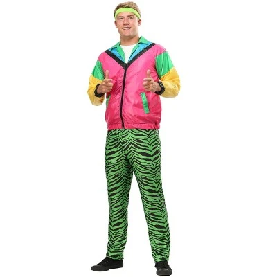 The Fun Costumes Men’s 80s Jock CostumeIf you’re ready for a flashback, just slip into this 80s Jock Costume to get your own 1980s experience! This costume is exclusively Made by Us, and our team of artists, designers, and developers tapped into the vivid colors and patterns that defined 1980s fashion to bring this costume to life. With the neon color block jacket and green tiger-stripe pants, this costume is sure to have you saying “I love the 80s!”Product Design:We designed this costume as a jacket, pants, and headband combo. The jacket zips up the front and features a vibrant neon color block pattern. Meanwhile, the pants feature black tiger stripes on green fabric. They fit with elastic waistband. Complete the style with the included green terry cloth headband. A funky wig is optional and sold separately, but highly recommended!Product Details:Jacket: 100% polyester; pants: 97% polyester, 3% spandexJacket has separating front zipper, elastic sleeve cuffs & waistbandFunctional welted pocketsTiger-stripe print pants have elastic waistbandTerry cloth headband has elastic at backAbout Us:Fun Costumes are exclusively Made by Us and begin with passion, teamwork, and industry expertise decades in the making. Our products are proof that with the right people even a simple idea can grow into something incredible. We started in a small garage in Minnesota, providing costumes to our local community, and now we’re creating costumes for people all around the world.Bring back the 80s when you go in this Adult 1980s Jock Wind Suit Costume!