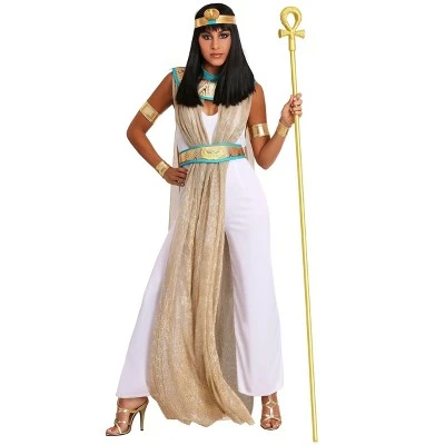 Stylishly rule over Egypt and Halloween with one convenient and classy costume. The Women’s Pantsuit Cleopatra Costume is a gorgeous Egyptian themed costume for ladies. It comes with a jumpsuit with attached collar and cape, an accenting belt, a pair of arm bands and wrist cuffs, as well as a coordinating headband!