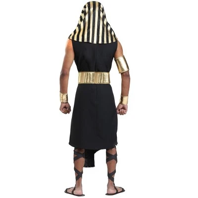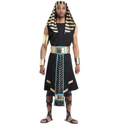 The Fun Costumes Dark Pharaoh Costume for AdultsOur Adult Dark Pharaoh Costume is a realistic historical outfit that’s perfect for Halloween, for plays and performances, and for history roleplay. In powerful black and gold, Egypt’s pharaohs have never looked so good. The costume features a long black tunic that secures in back with a hook and loop fastener. A gold foam belt features a symbol at the center front and a long geometric panel with gold and turquoise accents. The costume is accessorized with gold armbands and the instantly recognizable Pharoah headdress that falls around the shoulders.Product Details:Tunic fits with a hook and loop fastener in backStriped headpiece fits with elastic bandHeadpiece measures 22″ in lengthBelt secures with hook and loop fastenerBelt panel hangs down 31″ inchesWrist band and arm band cuffs secure with hook and loop fastenersAbout Us:Fun Costumes are exclusively made by us and begin with passion, teamwork, and industry expertise decades in the making. Our products are proof that with the right people even a simple idea can grow into something incredible. We started in a small garage in Minnesota, providing costumes to our local community, and now we’re creating costumes for people all around the world.