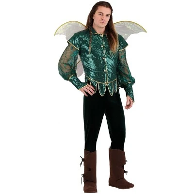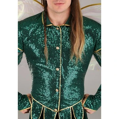 Just because you have wings doesn’t mean you can’t be tough! Transform into an ancient magical warrior with a Men’s Forest Fairy Costume! The vest and shirt combo features puffed sleeves, fitted cuffs, gold-tone buttons, and plenty of sequins. The slim-fit velvet pants have an elastic waistband for a comfortable fit. The wings are made of sheer iridescent fabric and attach to the shirt with metal snaps.