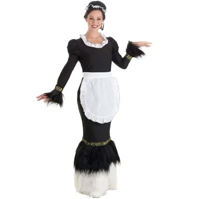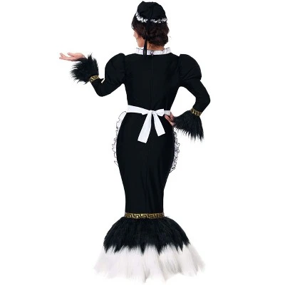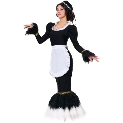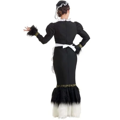 Cleaning the house has never been so classy! The long black dress has puffed sleeves and is trimmed with geometric gold and long faux fur that has a feathered look. The faux fur on the hem has white on the bottom and black at the top. It has touches of maid-like details such as the ruffly white apron and the ruffled cap but the high-class silhouette puts you a cut above the rest!