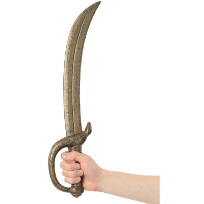 Ahoy there, matey! Is it wild adventures on the high seas that you seek? Are your land lubber legs itching to step aboard a mighty vessel destined for treasures and untamed landscapes? Do you look really good in a bandana and an eye-patch? Well then, perhaps it’s about time you dropped that smartphone of yours and picked up a sword to become scurvy pirate of the seas! Okay, so maybe it’s okay if you keep your smartphone, but if you want to make it as a swashbuckling sea dog, then you’d better bring this Golden Pirate Cutlass along for the journey.Modeled after the deadly weapons wielded by buccaneers of an age long ago, this toy Pirate Cutlass is molded to add a fierce look to your costume experience. With an gold paint-scheme that gives it the look of a captain’s treasure, this sword will have you feeling like the top dog in no time! Of course, this thing is made of plastic, so don’t go starting fights with any real pirates.
