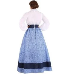 This timeless costume features a one piece dress that zips up the back. The blue calico skirt is floor length and has a wide waistband to add shape. The blouse has a peter pan collar and a billowy sleeves that are cuffed at the wrist. Accented with a classic cameo, this costume will make a gorgeous impression for all sorts of occasions!