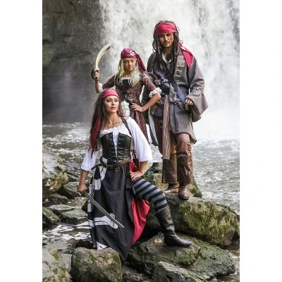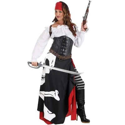 The Fun Costumes Jolly Roger Flag Pirate Costume for WomenReady to set sail on the high seas? You’ll be all set to join a pirate crew when you go in this fantastic Pirate Flag Costume for Women. Artfully and expertly designed right in our own Made by Us costume design studios, this stunning design raises the bar when it comes to a typical pirate costume. It features a detailed design—complete with the Jolly Roger flag boldly printed right on the skirt.Attention to DetailThis costume features a blouse, corset, skirt with attached underskirt, leggings, scarf, belt, and a harness. The striped leggings and off-the-shoulder peasant blouse form the base layer with a faux leather corset that fits over the shirt. The detailed 2 layer wrap skirt secures with buttons and fabric ties at the waist. The finishing touches are the faux suede belt and harness along with a triangular headscarf that can be worn as desired.Product Details:100% polyesterLong-sleeved peasant blouse has elastic at neckline, waist & sleeve cuffsFaux leather corset has elastic back panel, black cord lacing at center front2-layer wrap skirt has buttons & fabric ties at waist, printed skull & crossbonesStriped leggings have elastic waistbandFaux suede belt & harness have antique-brass-tone metal bucklesTie triangular scarf as desiredWrap skirt has unfinished hemlineAbout Us:Fun Costumes are exclusively Made by Us and begin with passion, teamwork, and industry expertise decades in the making. Our products are proof that with the right people even a simple idea can grow into something incredible. We started in a small garage in Minnesota, providing costumes to our local community, and now we’re creating costumes for people all around the world.Get this Women’s Pirate Flag Gypsy Costume for a faux pirate adventure this Halloween!