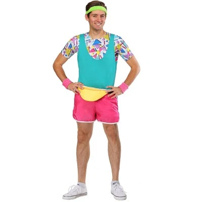 The Fun Costumes 80’s Work It Out Costume for MenBring the neon-colored exercise energy to your next Halloween party with this Adult 80’s Work It Out Costume. Artfully and nostalgically crafted in our costume design studios, this made by us exclusive outfit is guaranteed to let you bring your best aerobic routine to every occasion. This Men’s Work It Out 80’s outfit features a cool combo of a printed top, teal tank, pink shorts, yellow fanny pack, and a coordinating headband and wristbands. Looking fly, guy!Product Details:Shirt: 88% polyester, 12% spandex; tank top: 96% polyester, 4% spandex; all other pieces: 100% polyesterPullover cropped tank top has deeply scooped necklineShort-sleeved pullover geometric print shirtShorts have elastic waistband, white edging & side stripesHeadband has elastic at backWrist bands slide onFoam bag has zipper closure, webbing belt with plastic parachute buckleAbout Us:Fun Costumes are exclusively made by us and begin with passion, teamwork, and industry expertise decades in the making. Our products are proof that with the right people even a simple idea can grow into something incredible. We started in a small garage in Minnesota, providing costumes to our local community, and now we’re creating costumes for people all around the world.
