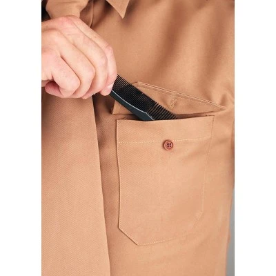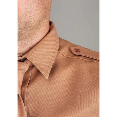 - Shirt has buttons at center front, sleeve cuffs, functional pocket flaps, & epaulets