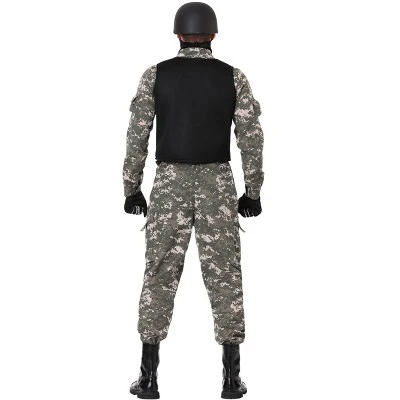 The Fun Costumes Battle Soldier Skull Mask Costume for MenSuit up for action in this Adult Battle Soldier Costume! A Fun Costumes exclusive, we take our costume designs seriously and we know that soldiers are one of the most popular costume themes every Halloween. That’s why we went all-out in designing this deluxe costume style. Made our own costume studios by our talented team of artists, designers, and developers, we crafted this costume with style that stands out and a durable quality that will last for many adventures.Product Design:The intense style of this Adult Army Soldier Costume starts with the digital camo print jumpsuit. It has functioning cargo pockets and an embroidered flag patch on the arm. The vest is made of mesh, featuring 4 front cargo pockets it secures in the center front with plastic clips. The helmet and accessories give you a mission-ready look, and when you wears the skull print gloves and skull mask bandana over your face, you’ll feel ready for battle.Product Details:100% polyesterJumpsuit has hook & loop fastener at center frontMultiple functional pocketsVest has multiple pockets, fastens with plastic parachute bucklesElastic belt fastens with plastic parachute buckleFace mask covers neck & lower half of face; hook & loop fastener at backGloves & mask have printed graphicsPlastic helmet has foam ring inside for comfort & positioningToy gear is molded plasticAbout Us:Fun Costumes are exclusively made by us and begin with passion, teamwork, and industry expertise decades in the making. Our products are proof that with the right people even a simple idea can grow into something incredible. We started in a small garage in Minnesota, providing costumes to our local community, and now we’re creating costumes for people all around the world.