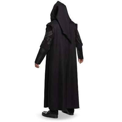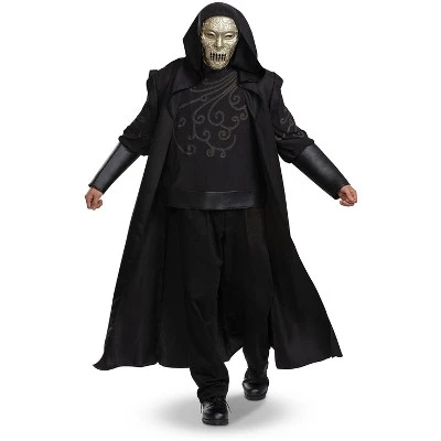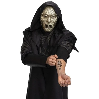 Show your loyalty to Lord Voldemort with this Death Eater Deluxe Adult Costume. Together, you can purify the wizard world from Harry Potter and others just like him. This costume features a black hooded robe with attached shirt with swirl patterns, mask, and even a temporary tattoo for the complete look.