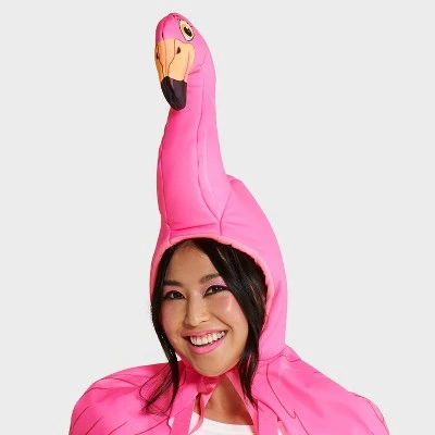 Flock to Halloween soirees in sweet style sporting this Adult Oversized Flamingo Halloween Costume Mask from Hyde & EEK! Boutique™. This Halloween costume mask is designed as a flamingo face complete with a long neck, big eyes and a curved bill. It’s designed with large pink wings that sit on the shoulders and on the back to complete the look. Made from lightweight material and featuring a padded design, this flamingo costume mask features a front-open design with ties to keep it securely at place.