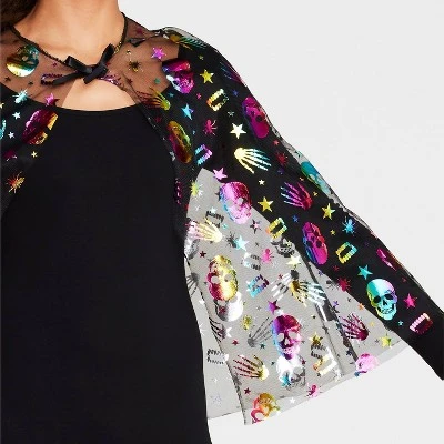 Bring fashionable, spooky style to the festivities when dressed in this Rainbow Skull Halloween Costume Accessory Kit from Hyde & EEK! Boutique™. The costume accessory kit includes a cape with sparkly rainbow skulls, bony hands and fangs, plus a matching pointy witch’s hat for a fun look. Layer this accessory kit over black jumpsuit to complete the cool look.