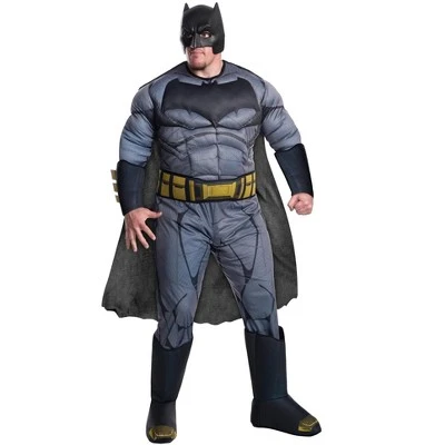 Take down any threat to your city in our Men’s Plus Size Batman V Superman: Dawn of Justice Deluxe Batman Costume. Whether it’s the Joker, an alien invasion, or even Superman, you must bring them to justice. This particular outfit comes as single piece jumpsuit with built-in muscle padding along the upper body. It is all grey with stylish black designs and 3D symbol. There are also gauntlets and boot tops included with the order, along with a utility belt which all add a high level of authenticity. Complete the appearance with a fabric cape and plastic molded mask. Wear this Batman costume during Halloween, themed events, and conventions for a fun time. Browse our list of accessories and props to use during your plans for vengeance.