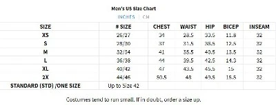 - Costumes are sized differently to apparel. Please check size chart to ensure best fit.