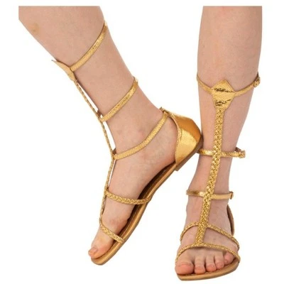 Are you a Cleopatra looking for your Marc Antony? Look no further than these Cleopatra Women’s Sandals. The flat sandals feature gold braided straps on the feet and solid buckled straps on the ankles and calves. The T-strap running up the front gives you the perfect Ptolemaic look for a Halloween costume that wows.