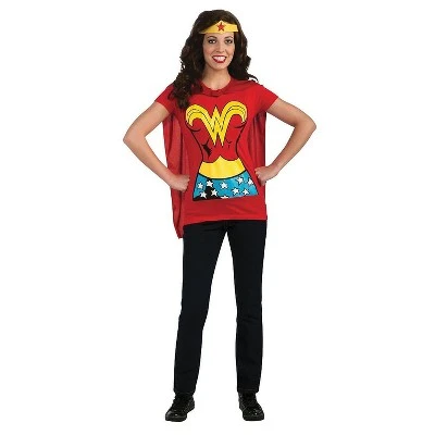 This Wonder Woman costume shirt works for parties or handing out candy at the door on Halloween. The costume includes a shirt with removable cape and headpiece.