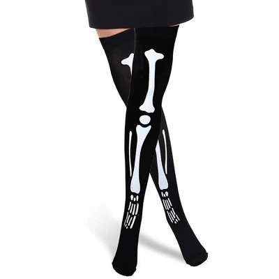 Skeleteen Adult and Child Crazy Skull Leg Warmers Costume Pantyhose is ideal for dress up costumes and pretend play. It is great for the legs but can stuffed with paper towel for a dummy figure. These legwarmers work with mens, womens and kids attire. The thigh highs can be used for running socks for boys and girls, or for cool, October season soccer or baseball socks. These socks are tall and with maximum coverage to feel fully dressed at all times. These xray socks are great to get as a funny gift for your crew if they are into anatomy or hideous clothes. These socks have a design up to the last toe, up the feet and legs, until past the knees. They will fit a toddler, kid or youth, but the bones may hit in the wrong place. These cosplay x ray socks are ideal for skeleton costume accessories, or for a family dress up theme for a Halloween Party. These tube socks stretch to fit men and women and fit nicely on most every boy and girl. These cute ladies socks will add spirit to your party when used as a decoration. Just stuff the legs up with something soft to get them to look like they are real. These socks make a great gift for kids who love pretend play and dress up and are a great addition to his or her costume chest.