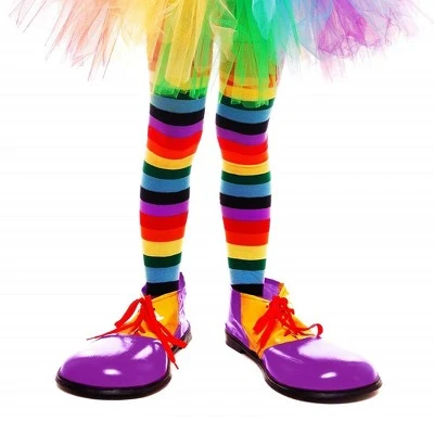 Skeleteen Multicolor Mens, Womens and Kids Dress Up Socks are classic striped funky socks that can be used by any adult or child as a part of a costume. It works for costumes of a colorful sock monkey, Camilla in A Bad Case of Stripes, as Rainbow Dash from My Little Pony, Pippy Longstocking, etc. These socks can also be worn as part of a set of clothes to a Gay, Pansexual or LGBTQ Pride Parade. The bright colors are every girls favorite! They can be worn as soccer socks, nerd apparel, for a skittles costume, a unicorn costume, or as under the boot socks. These socks are the length of thigh highs, which means they are very tall and can look like tights. Whether these rainbows stripe socks are used for athletic purposes or for dress up, like Halloween, every girl and guy will love the color stripes on it! They are fun to wear and complete crazy outfits! These socks are from the top gifts to give to a kid who loves pretend play and cosplay. They can be worn to a rodeo. They can be worn as mismatched socks with a pair of polka dot socks. They can also work for school sports practice, like baseball or softball, whether done in the gym or outdoors. These socks fit over the knee for an adult, which means they will hit high up for a child, and they will be too big for a toddler. These socks are the perfect accessory for whatever you are choosing to wear it for.