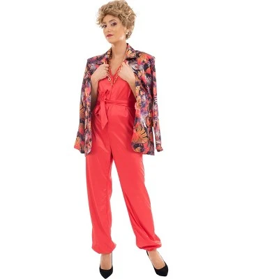 - FASHION FORWARD: Costume includes red sleeveless v-neck jumpsuit with Velcro front closure, floral patterned blazer featuring shoulder pads and Velcro front closure, gold costume jewelry clip on earrings and costume jewelry necklace.
