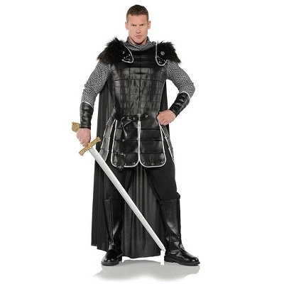 Create your own epic adventure! The days of chivalry and justice have begun when you wear this striking Warrior King Adult Costume. Costume includes tunic with attached fur trimmed cape and chain mail print sleeves, faux cowl neck, pants, skeleton half mask, belt and arm covers. Tunic and belt are adorned with studs. Just add boots and a costume sword and you’re ready for battle.